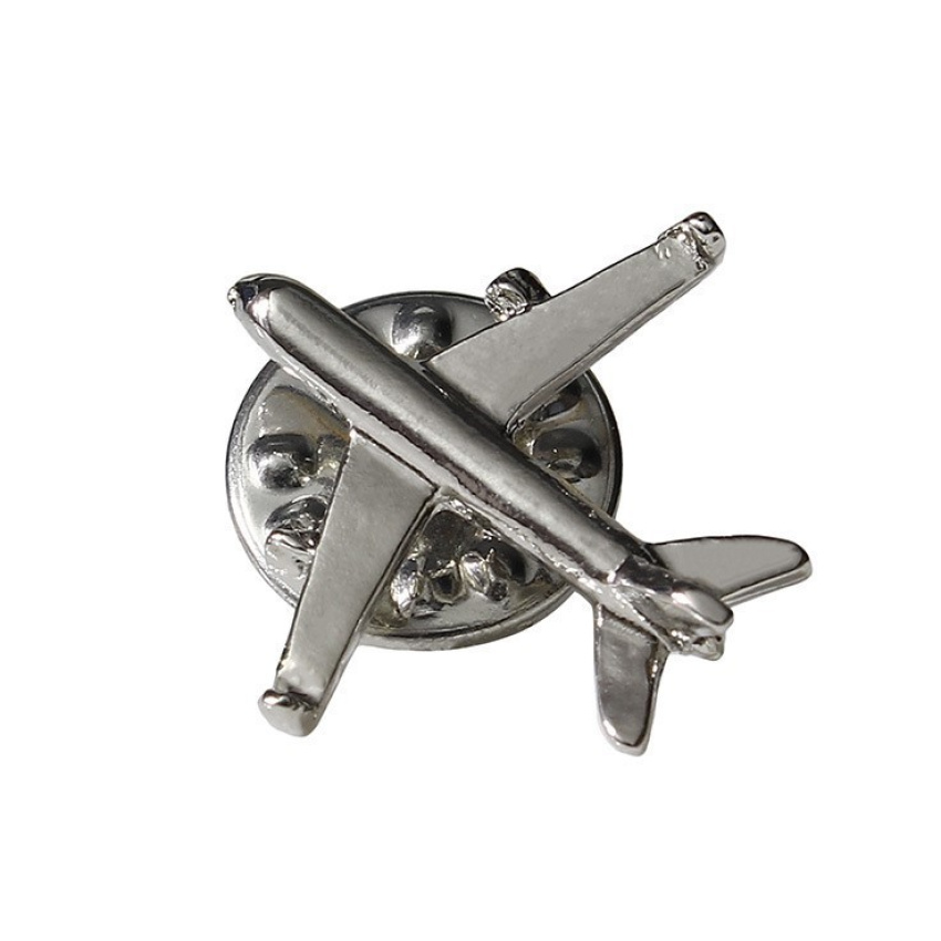 Airbus metal pin in the shape of A320neo. Crafted as a detailed three-dimensional miniature, it captures the distinctive shape of the aircraft in polished metal. Secured with a butterfly clutch fastener.