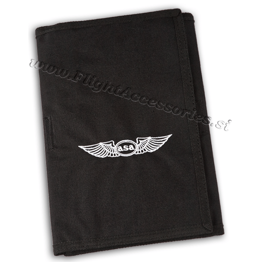 Strong aluminum tooled clipboard fits snugly into black 3-panel jacket. Has room for charts, books, flight computers, etc. Useful information on board, strong elastic leg strap.