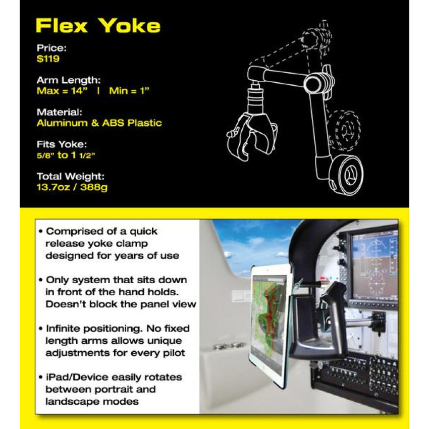 The Flex Yoke has been designed to meet the needs of pilots and attaches to any yoke shaft or any other bar from 1.59cm (5/8") to 3.81cm (1.5") in diameter.