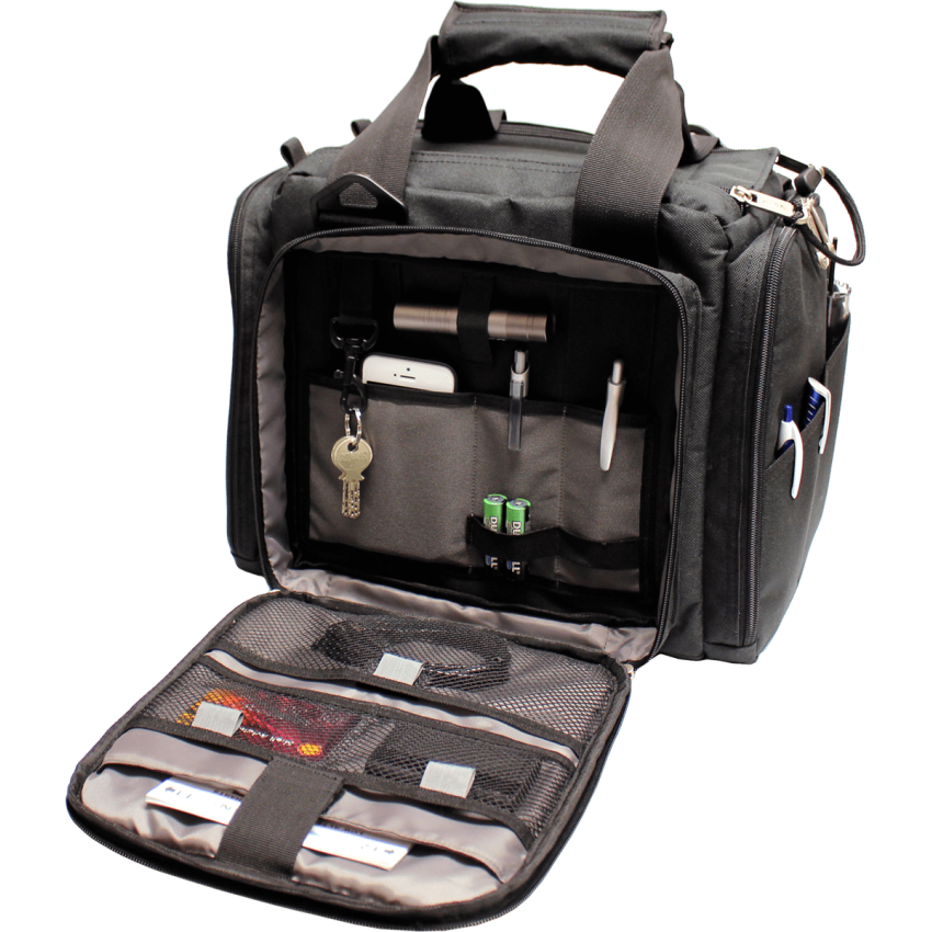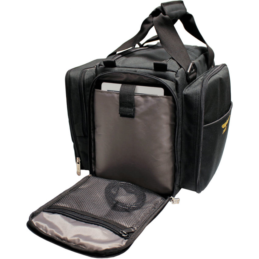 On each end face of the bag there is an outside pocket. One for a tablet and the other one includes 3 mesh pockets so you can find all your items very quickly.
