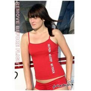 The spaghettit top in red is made from 100% cotton and is of the finest quality. Red with vertical NO PUSH NO STEP NO TOUCH Text in white.